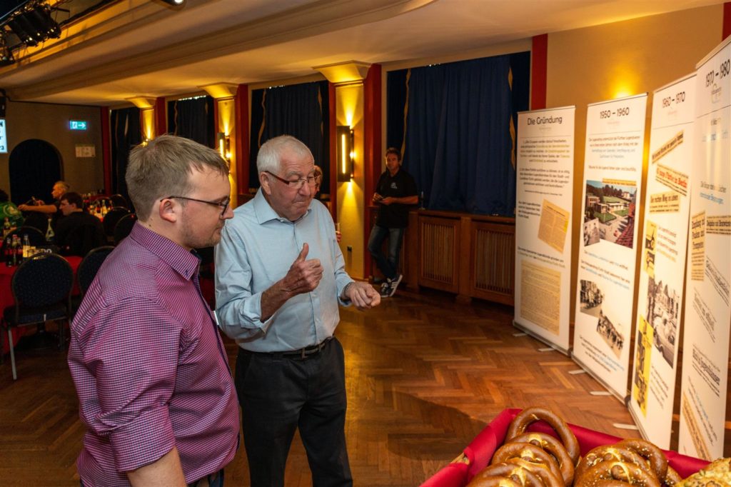 Nach der Pause hatte sich auf der Bühne was getan: es wurde Zeit für einen launigen Rückblick vom Vorstand Johannes Plonka. Dafür wurde eine große Leinwand aufgezogen und der Projektor angeschmissen. Um es nicht zu ausufernd werden zu lassen, beschränkte sich Jo auf die vergangenen 25 Jahre. Die restlichen Highlights wurden im hinteren Teil des Saals auf Roll-Ups und Stellwänden ausgestellt.