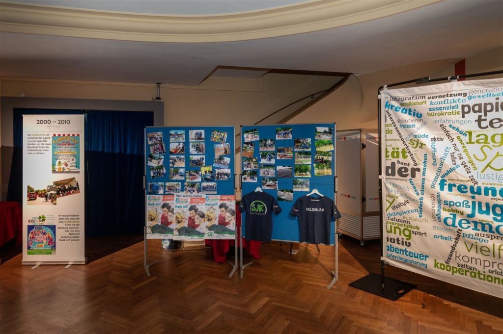Nach den vielen Reden und der Ehrung zum Schluss gab es noch einen gemütlichen Teil zum Abschluss des Abends. Die Ausstellung im hinteren Teil des Saals regte viele Gespräche an und man nutzte die Zeit, um mit alten Bekannten über die gemeinsame Zeit im Jugendring zu plauschen oder sich auf den aktuellen Stand zu bringen. Bei Häppchen und Getränken wollten manche fast nicht mehr gehen und mussten schließlich von uns herauskomplimentiert werden, als wir zu später Stunde noch aufräumen mussten.